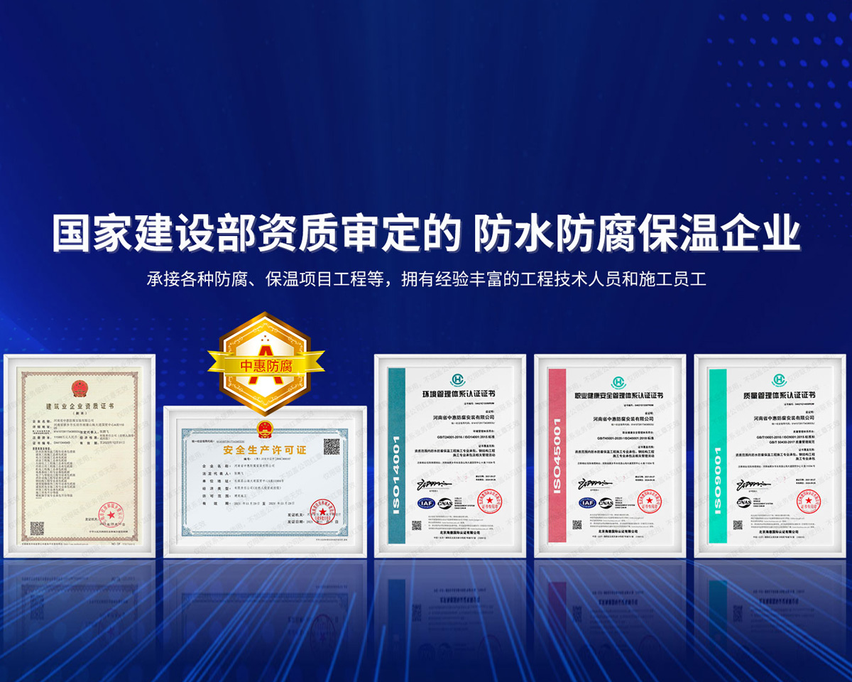 公司經營范圍:防水防腐保溫工程;消防設施工程;建筑裝修裝飾工程;建筑機電安裝工程;電力工程;建筑工程;石油化工工程;工業清洗工程;油罐清洗工程;鋼結構工程;環保工程;模板腳手架工程;電纜防火封堵、防污閃噴涂、外墻外保溫工程;各類施工勞務作業;設備維修、船舶鉚焊、涂裝;電力工程材料、建材、防水材料、防火材料、防腐保溫材料銷售,并相繼通過了GB/T19001-2008idtISO9001:2008GB/T50430-2007質量管理體系認證證書。GB/T24001-2004idtISO14001:2004環境管理體系認證證書。GB/T28001-2011idtOHSAS18001:2007職業健康安全管理體系認證證書。公司是中國防腐蝕于防護協會、中國施工企業管理協會、電力協會和中國鋼結構防水協會會員單位。 公司的經營業務涵蓋了石油、化工、電力、冶金、煤炭、船舶、國防、燃氣、水利、環保、交通運輸、航空及國防軍工和輕紡市政等行業的防腐保溫絕熱設備。鋼結構安裝、防火、防水、金屬噴鍍、聚脲噴繪、陰極保護、防滲透堵漏、玻璃鋼及各種磚版材料襯里、橡膠襯里、煙氣硫和耐酸溶劑腐蝕等工程施工。公司連續十年榮獲“省市先進施工企業”“安全生產先進單位”“重合同,守信用企業”和“AA***資質企業”的稱號。2000年被命名為市級文明單位,2002年被國家工商行政管理局命名為“重合同,守信用的企業”、被中國工業防腐蝕技術協會命名為“防腐蝕企業,能源節約及環境保護領域有豐富的經驗和***的業績。工程一次交驗合格率100%。其中攀枝花鋼鐵公司煉鐵廠四號高爐及熱風爐防腐工程、上海寶鋼公司煤氣柜防腐工程、撫順石油一廠裝置防腐項目、齊魯石化公司稀烴廠高塔防腐工程、吉林化學工業公司煉油廠油罐防腐工程、天津石化熱電廠六號爐頂棚聯絡管保溫工程、大慶油田(太倉)力神泵業工程、中國化學工程第十一建設工程、中原油田勘探局工程、中國石化銷售有限公司華北分部、魯皖輸油管道工程、貴州開磷息烽合成氨工程、陜西黃陵煤化工程、中國石油天然氣西部管道塔里木輸油工程、邯鋼集團邯寶鋼鐵公司煉鐵工程、德州供電工程、吉寶(南通)船廠工程,偃師華潤熱力工程、鄭州熱力總公司。 河南省中惠防腐安裝有限公司愿以豐富的施工經驗,***的技術,***的設備,***的管理,***的服務,竭誠為國內外廣大的用戶提供***滿意、******的工程作品。 我公司愿與國內外同仁一道,團結協作,共同推進防腐蝕行業發展! 公司地址:河南省長垣縣建設路北段360號 固定電話:0373-8866488 郵編:453400 網址:http://www_zhff_com_cn.yj18g.com